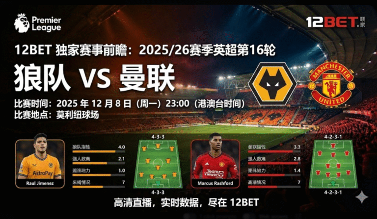 两队近期状态均呈回暖趋势。狼队主场防守稳健,而曼联的进攻端逐渐找回节奏。本场比赛预计将呈现激烈的中场对抗与多次精彩进球。通过 12BET 平台,球迷可观看高清直播并获取实时数据,全面沉浸于这场英超焦点对决。