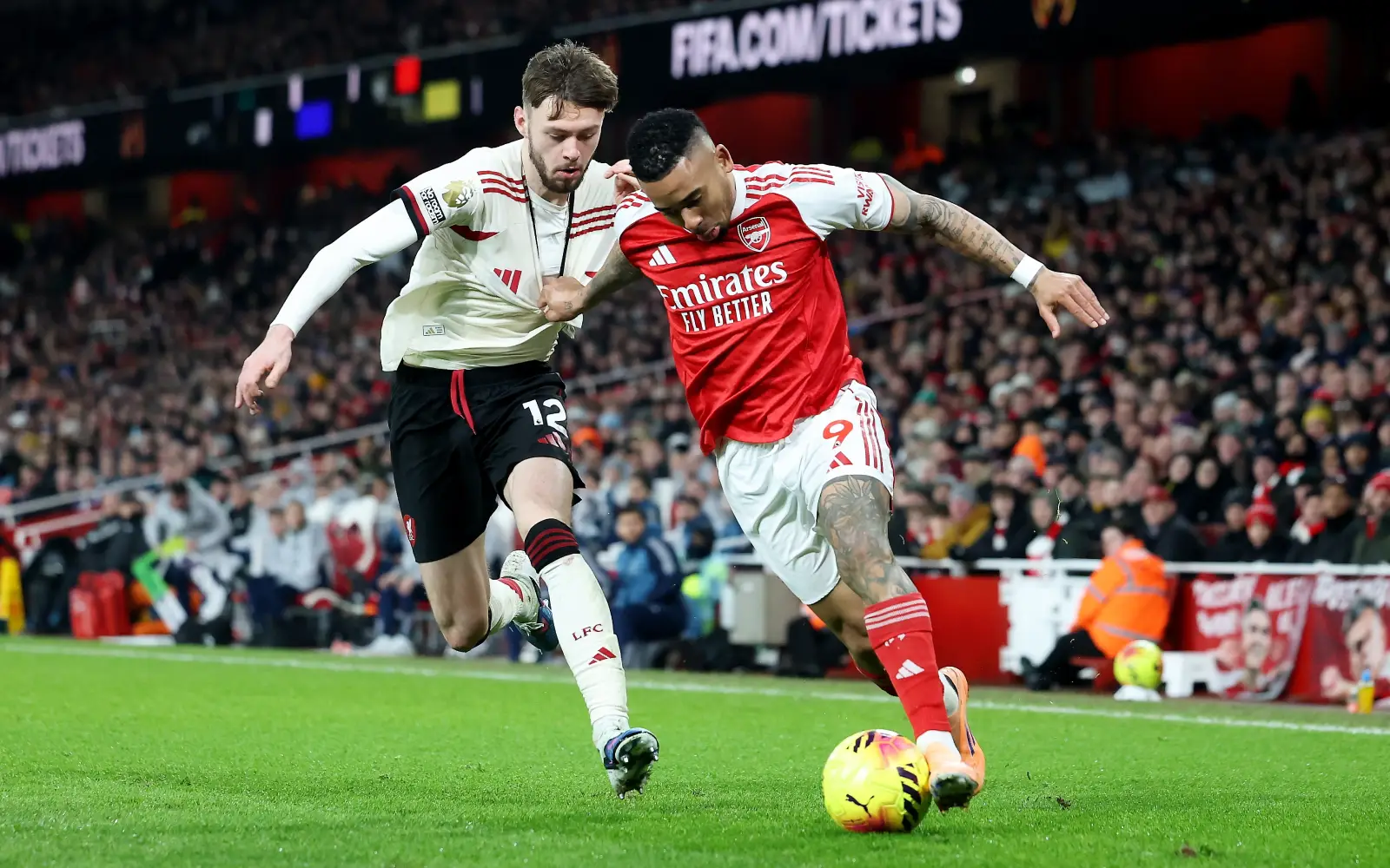 豪尔赫·昆卡 的长传被 劳尔·希门尼斯 巧妙一蹭,哈里·威尔逊 快速前插,在 格拉文贝赫 回防到位前完成射门,皮球直入远角,门将 阿利松 无能为力。